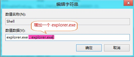 三、将SHELL值修改成 explorer.exe,explorer.exe 如下图:
