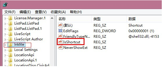 1、依次找到HKEY_CLASSES_ROOT\lnkfile,然后在右边空白的地方点击右键,新建 – 字符串值 – IsShortcut