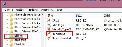 2、接着再依次找到HKEY_CLASSES_ROOT\piffile,然后在右边空白的地方点击右键,新建 – 字符串值 – IsShortcut