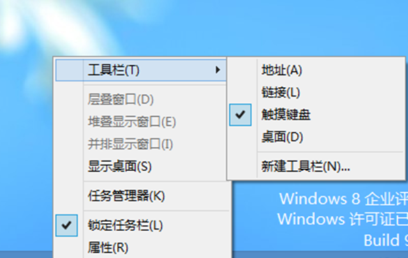 三、在win8传统桌面上任务栏右击选择“工具栏”,可以找到“屏幕键盘”,然后在任务栏上显示打开屏幕键盘的快捷按钮,单击打开