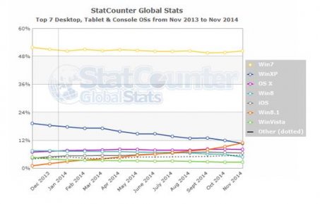 Win8.1首超WinXP Win7仍是老大