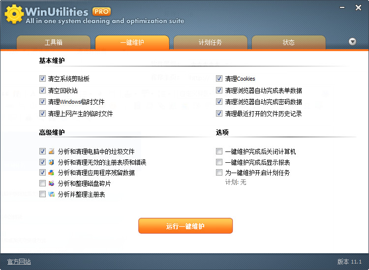 WinUtilities是一套Windows优化工具,WinUtilities提供的功能包括:磁盘清理 、注册表清理/备份、自启动程序管理、内存优化、查找重复文件、快捷方式修复、进程管理、卸载管理、系统信息、文件分割/合并、文件清除、可执行文件加密、家长监视控制以及调用Windows系统自带小工具等诸多功能。
