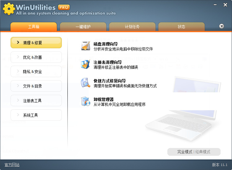 WinUtilities pro(系统优化工具箱)是一套Windows系统的性能和优化套件,WinUtilities提供的功能包括:磁盘清理 ,注册表清理/备份,自启动程序管理,内存优化,查找重复文件,快捷方式修复,进程管理,卸载管理,系统信息,文件分割/合并,文件清除,可执行文件加密,家长监视控制以及调用Windows系统自带小工具等诸多功能。