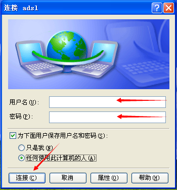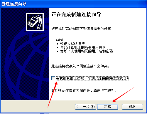 点完成弹出宽带连接对话框 完成,刚才前面没有输入用户名和密码的现在可以在这里输入现在可以看看你的 网络连接里面已经多了个宽带连接了要是已经设置了请直接点连接开始上网吧!