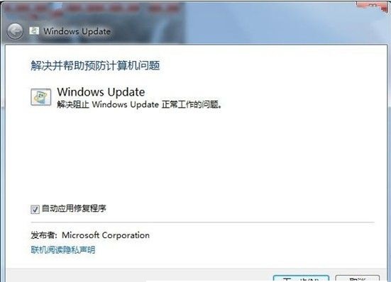 在解决阻止Windows Update正常工作的问题页面,用户可以点击“高级”来启用“自动应用修复程序”功能,接着点击“下一步”即可,即可监测并解决Windows Update方面存在的问题。