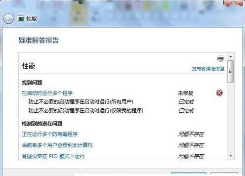在操作时,windows7会检测系统性能方面的问题,如系统启动时运行多个程序、运行多个防病毒程序、多个用户登录此计算机、高级视觉效果等;