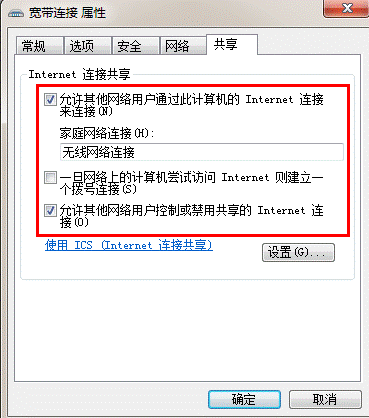 手动检查是否开启共享的方法,如下图本机使用ADSL拨号上网所以要确认宽带连接属性中的共享已经开启