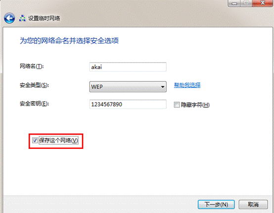 3. 输入网络名(ssid)、无线密钥(建议使用wep格式)、并勾选保存这个网络