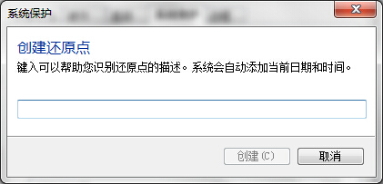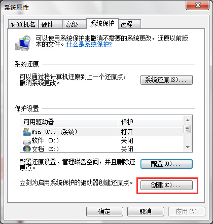 五、接着回到“系统保护”选项卡点击系统文件所在的盘符C盘,点击下方的“创建”,然后创建一个当前时间的还原点后,点击“确定”退出。如下图所示: