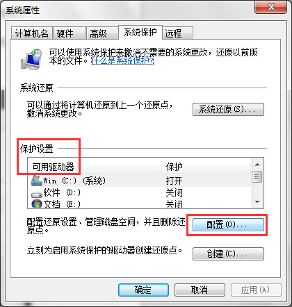 三、在系统属性窗口的“保护设置”下方“可用驱动器”中选择系统盘符,然后点击“配置”,如下图所示: