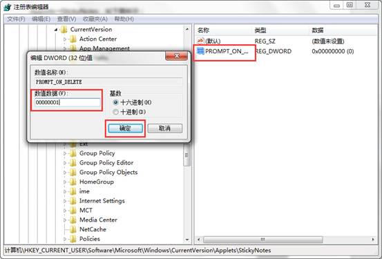 三、接着双击打开“PROMPT_ON_DELETE”项。 在数值数据框中输入“00000001”,然后单击“确定”。如下图所示:
