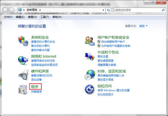 一、点击“开始→控制面板”,接着双击打开“程序”。如下图所示: