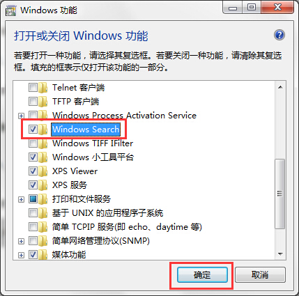 三、然后在打开的窗口中对话框中,找到并勾选“Windows Serach”,点击“确定”如下图所示: