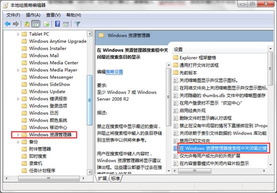 二、接着依次选择“用户设置→管理模版→Windows组件→Windows资源管理器”,然后在窗口右侧列表中找到“在Windows资源管理器搜索框中关闭最近搜索项目的显示”,如下图所示: