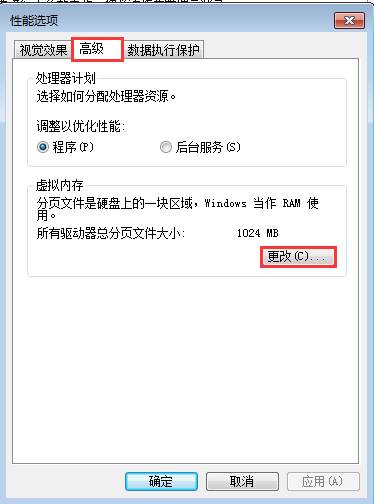 在“性能选项”中再次点击“高级”,然后点击“更改”,如图所示: