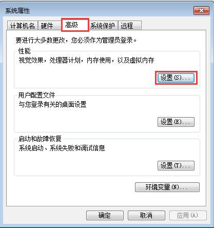 在系统属性选项卡中,点击“高级”,然后在再点击“设置”,如图所示: