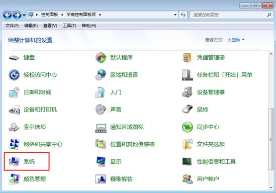 然后在查看方式中选择“大图标”,接着在列表中找到“系统”这个选项,点击进入,如图所示: