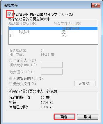 然后在“自动关了所有驱动器的分页文件大小”前勾选,最后点击“确定”,如图所示: