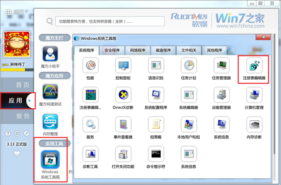 打开注册表,可以选择在“开始菜单”中搜索“regedit”,回车运行,或者Win+R,打开“运行”窗口,键入“regedit”,回车运行,或者打开魔方优化大师,在“应用”中找到“Windows系统工具箱”,打开“注册表编辑器”也可。