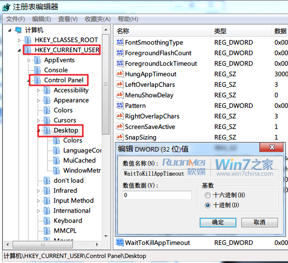 然后依次展开到“HKEY_CURRENT_USER\Control Panel\Desktop”,然后在右侧窗口空白处右键单击,选择“新建”,“DWORD 32位值”(PS:注意键值类型),并将其重命名为“WaitToKillAppTimeout”(PS:某些卫士软件有此功能,可能有些网友已经有此键值,那么无需新建,只需进行后续操作),同时把该键值的数值修改为0,点击“确定”之后就可以关闭注册表编辑器了。
