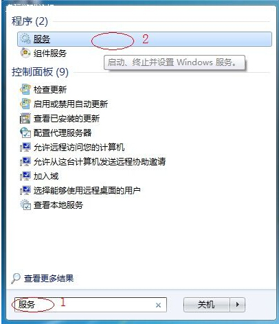 打开服务,点开始在搜索(1处)输入服务,上面出来结果,点击打开服务(2处):