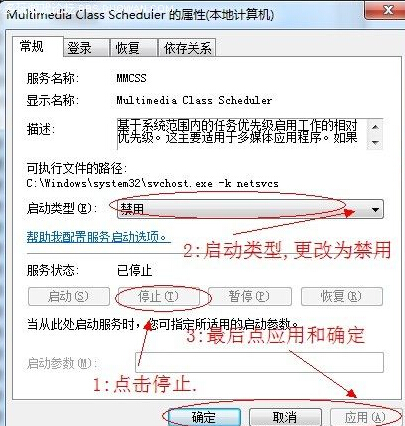 接着停止和禁用"Multimedia Class Scheduler"(此时右下角的喇叭图标会有个叉叉,音频也会没了,不用担心,等下都改好了,重启下系统就恢复了)