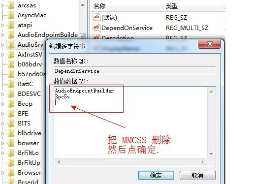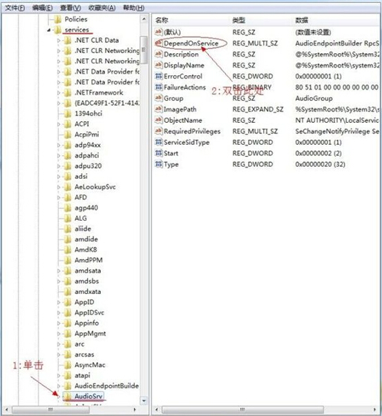 然后在/Services下面找到Audiosrv,再双击右面的项目DependOnService