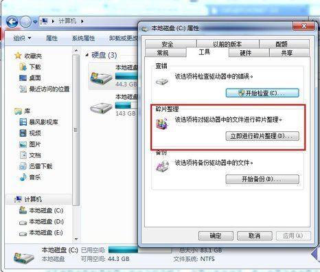 另外一方面,每个一段时间别忘记对硬盘进行一下碎片整理,适用Win7系统自带的磁盘工具即可完成,鼠标点击任一磁盘,然而选择属性,在属性窗口中就能找到磁盘碎片整理工具,由于电脑整体速度快慢收到磁盘很大的影响,因此定期进行磁盘检查工作时不能忽视的一点。