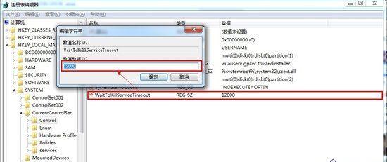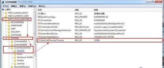 在打开注册表编辑器之后,在窗口中一次找到以下路径HKEY_LOCAL_MACHINE/SYSTEM/CurrentControlSet/Control,此时可以发现其中一项"WaitToKillServiceTimeOut",用鼠标右键点击修改可以看到windows7默认数值是12000,这就表示系统默认等待关机时间是12秒,如果想要加快关机速度,我们就适当把等待时间缩短,比如设置为7000(表示7秒)等。但这里提醒大家不要只追求快速,把数值修改太小那样对系统稳定性不太有利。