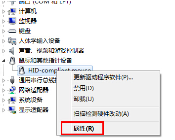 第二步:在设备管理器列表里面找到“鼠标和其他指针设备”下面的鼠标,并在上面点击鼠标右键------属性。如图: