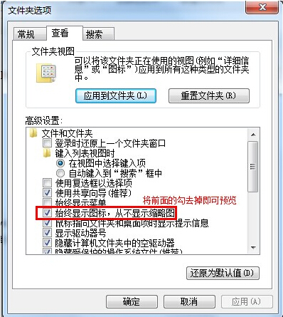 一、打开我的电脑(Win7为:计算机)-----工具(如果看不到请按一下Alt)-----文件夹选项----查看----将“始终显示图标,从不显示缩略图”前面的勾去掉