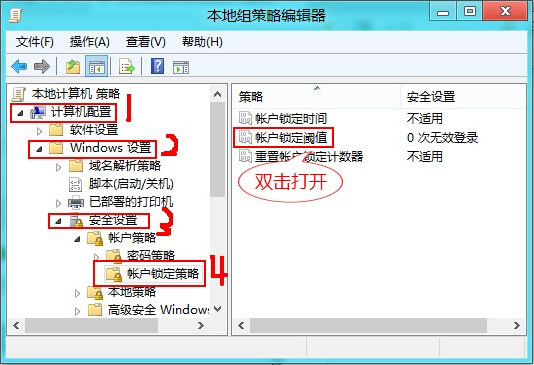 接着依次找到 计算机配置----windows设置-----安全设置------帐户锁定策略-----帐户锁定阀值