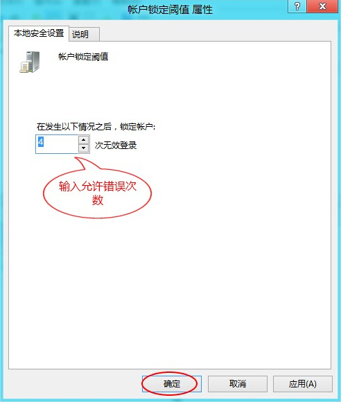 锁定帐户”里面的值改为你需要的值,例如图上所示的是4(如果开机的时候连续输错了四次密码,那帐户将被锁定)。