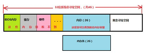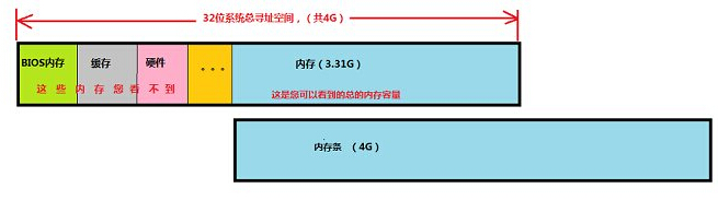 内存(RAM,也就是您的系统的寻址总空间)=内存条(物理内存,您的内存条是4GB的)+bios内存+缓存+显存+...,,32位的电脑的寻址空间是2的32次方,也就是4G,系统将这4GB的地址分配给内存条,缓存,显存,硬件等。