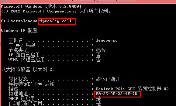 到这里,朋友们可能会问我为什么不是怀疑是相同的IP地址而是MAC地址呢?因为如果使用了相同的IP地址,那么在这两台之中其码有一台开机时会显示IP地址冲突。于是我使用 ipcofig /all 命令查看了本机的网卡信息,MAC地址为:00-25-AB-22-4E-9D 。如下图: