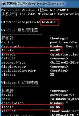 2.输入bcdedit,按回车。确认Windows启动管理器和Windows启动加载器下方的locale是否一致。