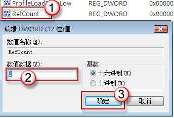 6、点击文件夹S-1-5-21-xxxxx在右边的窗口中双击RefCount,将数值修改为0。