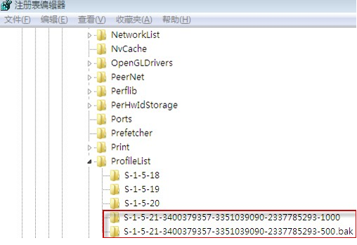 3、在左边会看到两个名字类似的文件夹,分别为:S-1-5-21-xxxxx 和 S-1-5-21xxxxx.bak(它们的前面是一样的,吸有后面有一个多加上了.bak)