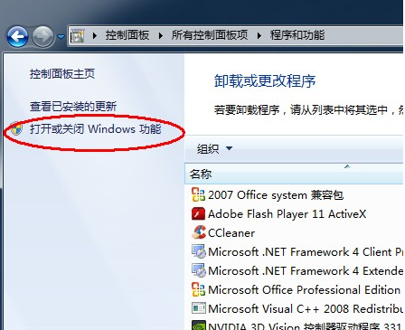 一、首先,点击左下角的开始按钮------>控制面板------>程序与功能。在程序与功能面板的左边栏,会看到一个“打开或关闭windows功能”的选项,点击它。如图: