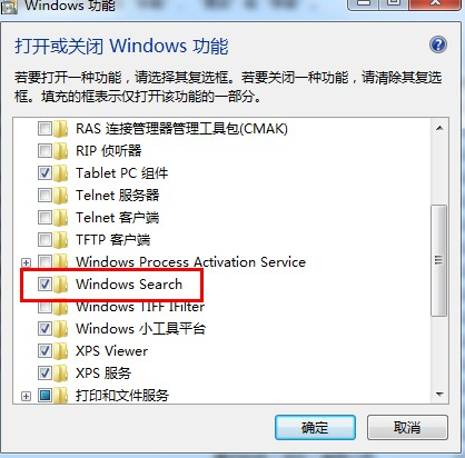 二、进入了windows功能面板后,在功能列表里面打到“windows search"功能。看其前面的勾是否有打勾,如下图: