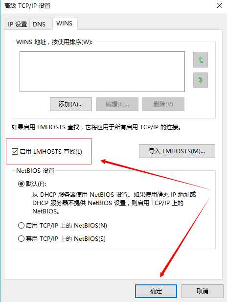 4、取消,启用LMHOSTS查找,前面的√。然后--确定。