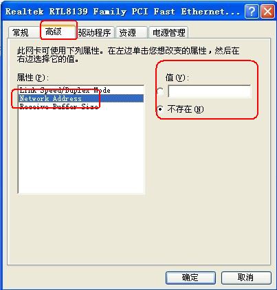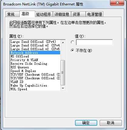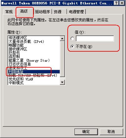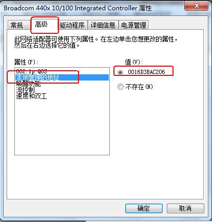 3、 在弹出的对话框中,点击“高级”标签,选择“本地管理的地址”,选择“值”,然后在对话框中输入新的MAC地址即可,此操作重新启动不会失效。注意输入MAC地址连续输入即可,不需要填加间隔横线。