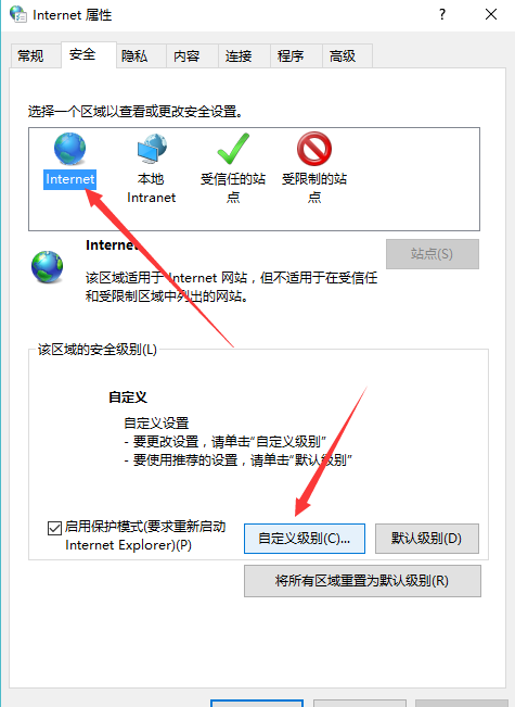 在管理窗口中,在安全选项窗口中的internet,我们点击打开自定义选项下面的“自定义级别“。