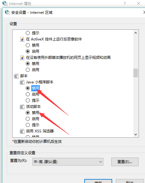 打开自定义级别,弹出窗口,我们接着在这个窗口中用鼠标往下拉,找到“脚本”选项后,并禁用它;