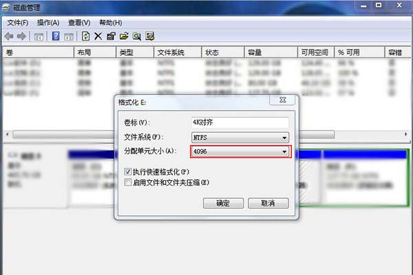 2. 选中固态硬盘,右键格式化,设置分区单元大小为4096