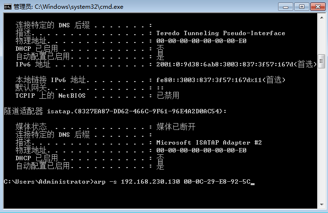3、例如要将IP 地址192.168.230.130与网卡MAC地址00-0C-29-E8-92-5C绑定,需要在“命令提示符”窗口中执行命令行arp -s 192.168.230.130 00-0C-29-E8-92-5C。如果要解除绑定,运行命令行arp -d 192.168.230.130即可。