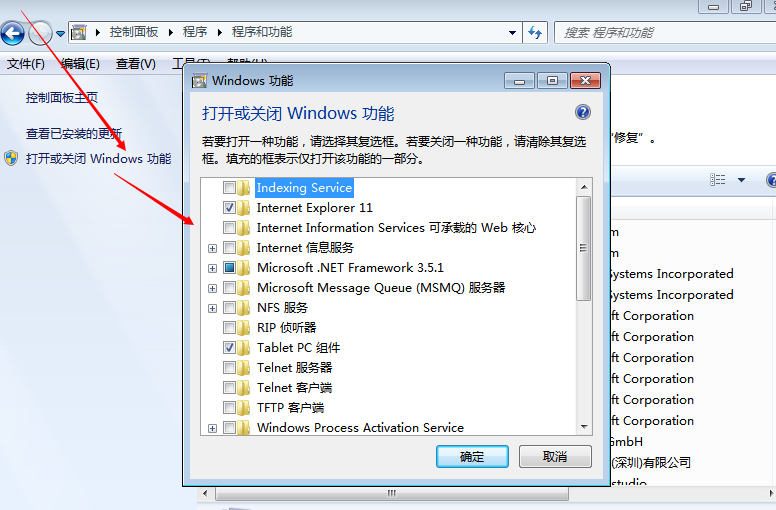 2、 "打开或关闭windows功能",会弹出windows功能的对话框, 这个对话框里面有许多windows的小功能,