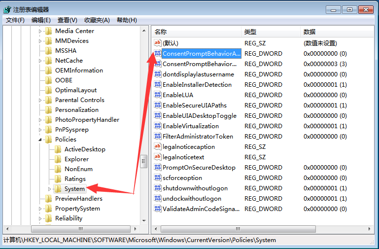 2、进入“注册表编辑器”窗口后,在左侧依次展开“HKEY_LOCAL_MACHINE/SOFTWARE/Microsoft/Windows/CurrentVersion/Policies/System”;