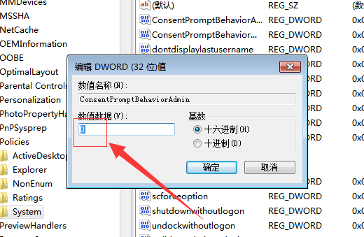 3、然后在右侧分别找到“ConsentPromptBehaviorAdmin”、“EnableLUA”、“PromptOnSecureDesktop”3个项,在其位置处右键打开菜单,然后选择“修改”,把“数值数据”修改为“0”,点击确定即可。