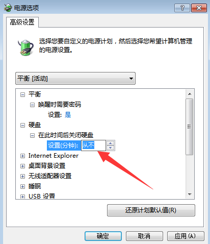 3、在“电源选项”窗口中,展开“硬盘”选项,将“在此时间后关闭硬盘”设置为“从不”,最后点击确定即可。